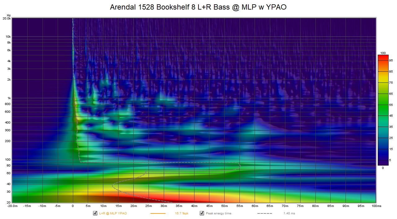 I ran a wavelet spectrogram comparing YPAO on/off and found YPAO on increased the bass delay from 25ms to 55ms around 60-80Hz which correlates to some of the problems we saw in the amplitude response with YPAO engaged.