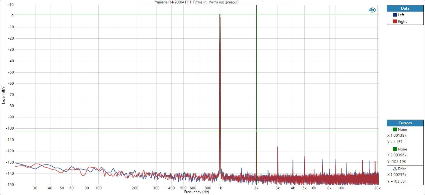 With the R-N2000A in analog Pure Direct driven by 1Vrms input, and output voltage of 1Vrms from the preouts, the FFT looked excellent with the 3rd order harmonic being 103dB below the 1kHz fundamental.