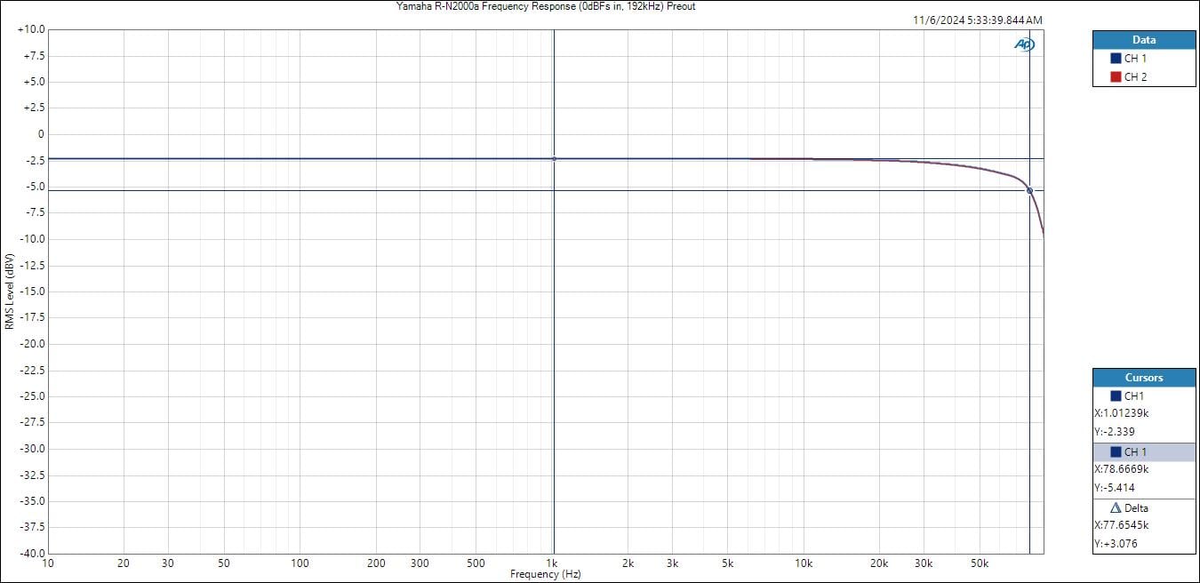 The Yamaha R-N2000A frequency response is ruler flat from 10Hz to 80kHz (-3dB) when driven with a 0dBFs 192kHz/24bit input.