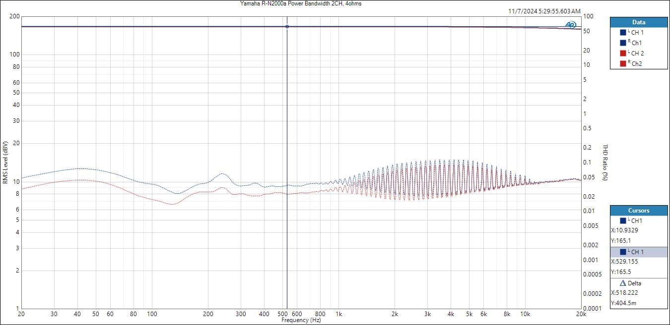 With both channels driven into 4-ohms at < 0.1% THD+N, the R-N2000A was able to deliver 165 watts/ch which exceeds its 145 watts/ch rating.