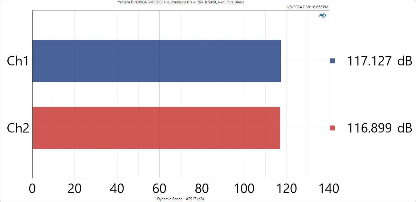 With a 44.1kHz/ 16 bit signal and 0dBFs input, I measured 96dB SNR (a-wt) which is theoretical perfection for 16 bit audio. With a 192kHz / 24 bit digital source of 0dBFs, I measured 117dB SNR (a-wt) at 2Vrms via the analog outputs in pure-direct and 113dB non pure-direct, which are excellent results and beat the R-N1000A by 6dB under the exact same test conditions!