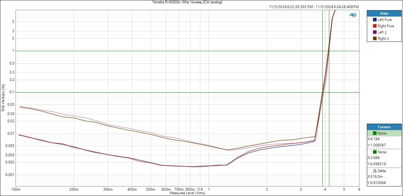 The Yamaha R-N2000A preamp outputs are strong just how I like them. Whether I tested the analog or digital inputs, the R-N2000A was able to muster a clean 4Vrms output free from clipping. The pure-direct analog input path had significantly lower distortion than with the DSP engaged. SINAD below 1Vrms was 96dB for analog pure-direct or via a digital input source which is superb. This dropped to about 86dB for analog sources with pure-direct bypassed. Above 1.14Vrms, you can see distortion rise due to the amplifier circuits reaching clipping and feeding back some of the clipping distortion into the signal path. Curious as I did not observe this behavior on the R-N1000A. Regardless, the distortion level below 3.5Vrms is still about 86dB or 0.005% THD+N which is inaudible.