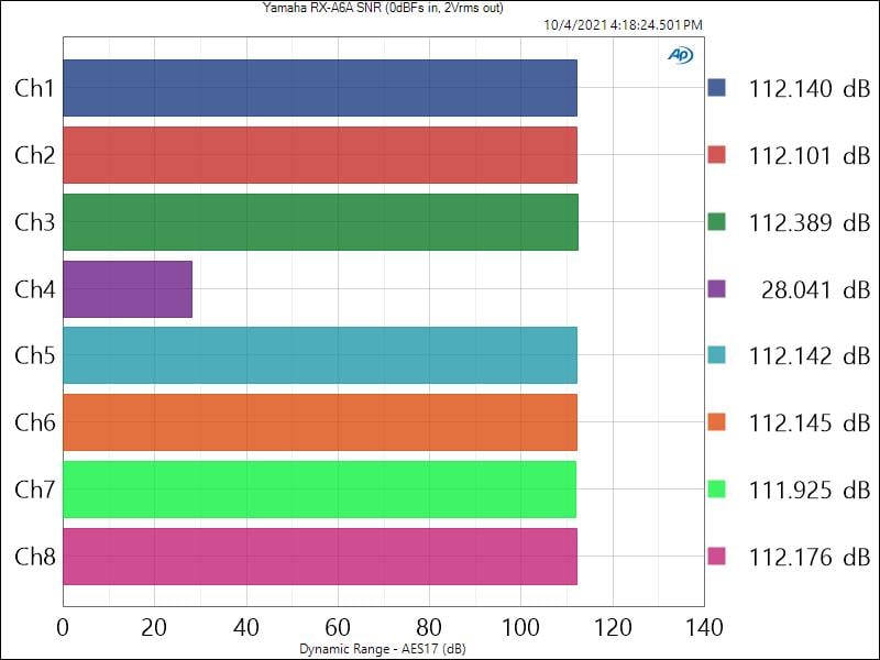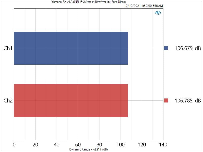 All measurements were conducted using our Audio Precision APx585 8 Channel HDMI Audio Analyzer. The Yamaha RX-A6A was defaulted to high-impedance (High Z) mode (8-ohms or more) and ECO Off unless otherwise stated.