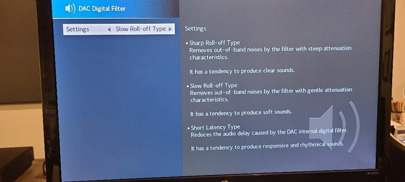 I compared the time domain behavior of these different DAC settings by using a 1kHz square wave to observe the over/under shoot behavior. The "short latency" exhibited the most asymmetric response and most overshoot of the 3 settings for the leading edge of the signal. The "sharp" and "slow"settings were most symmetric with the "sharp" being slightly better. From a measurements standpoint, I would recommend using the "Sharp roll-off" setting to best preserve the bandwidth.