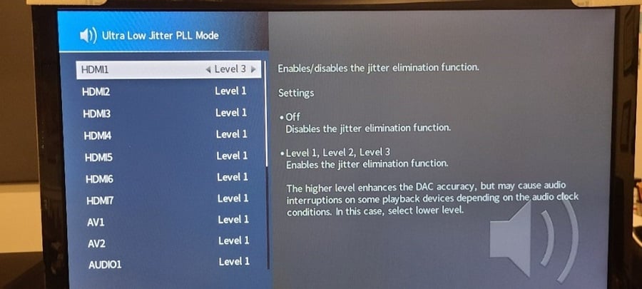 There was virtually no measurable change when selecting the different level options for the HDMI Jitter PLL Mode. I could barely measure a slight shift in the LPF response above 50Khz and the resultant distortion was very similar for high sample rate (192kHz) test signals.