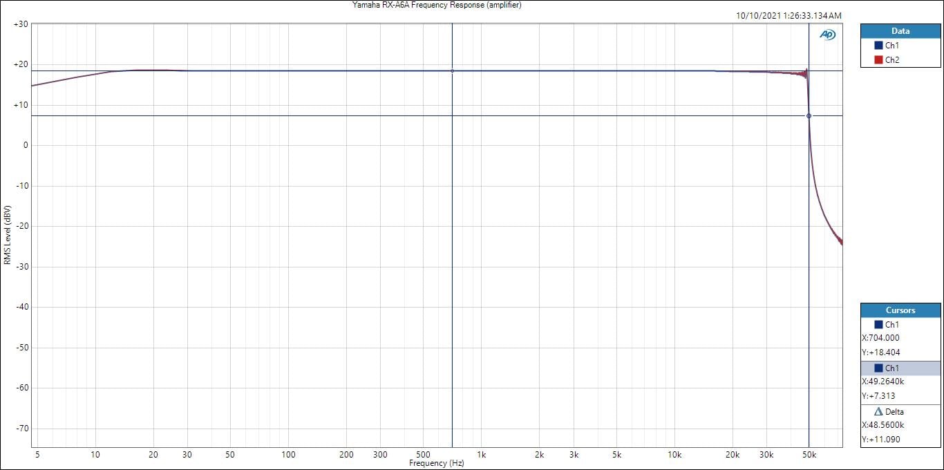 The RX-A6A exhibited ruler flat frequency response from the power amp all the way out to 48kHz when driving an 8 ohm at 10Vrms.