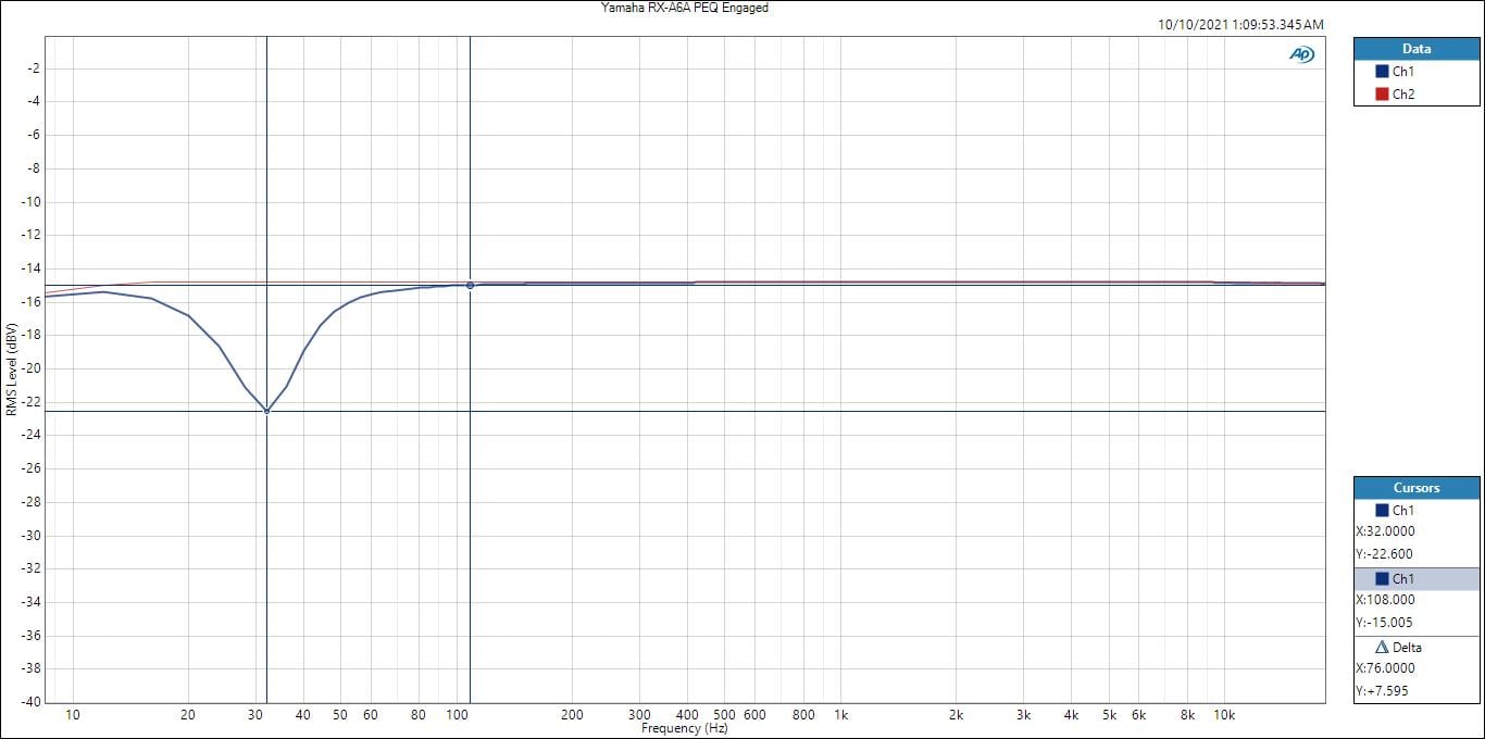 Yamaha’s manual PEQ function is perhaps my favorite tweak they offer. In their latest AVR’s, they’ve increased the resolution to allow for finer increments of adjustments of the center frequency. In the measurement below, I set Fc to 32Hz with a Q of 1.6 with a -8dB cut and that’s roughly what I measured.