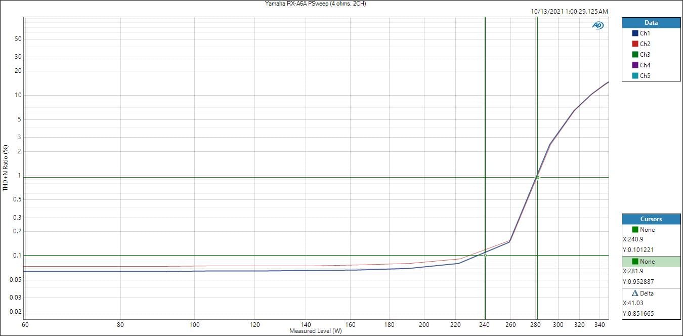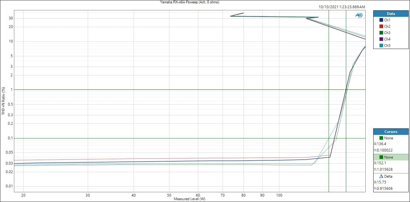 Even with the nannies turned off, Yamaha has built in protection to limit power with multiple channels driven as you can see the distortion rise to 10% (hard clipping) with 4 channels driven. I’ve seen this type of behavior before on other Yamaha receivers we’ve tested.