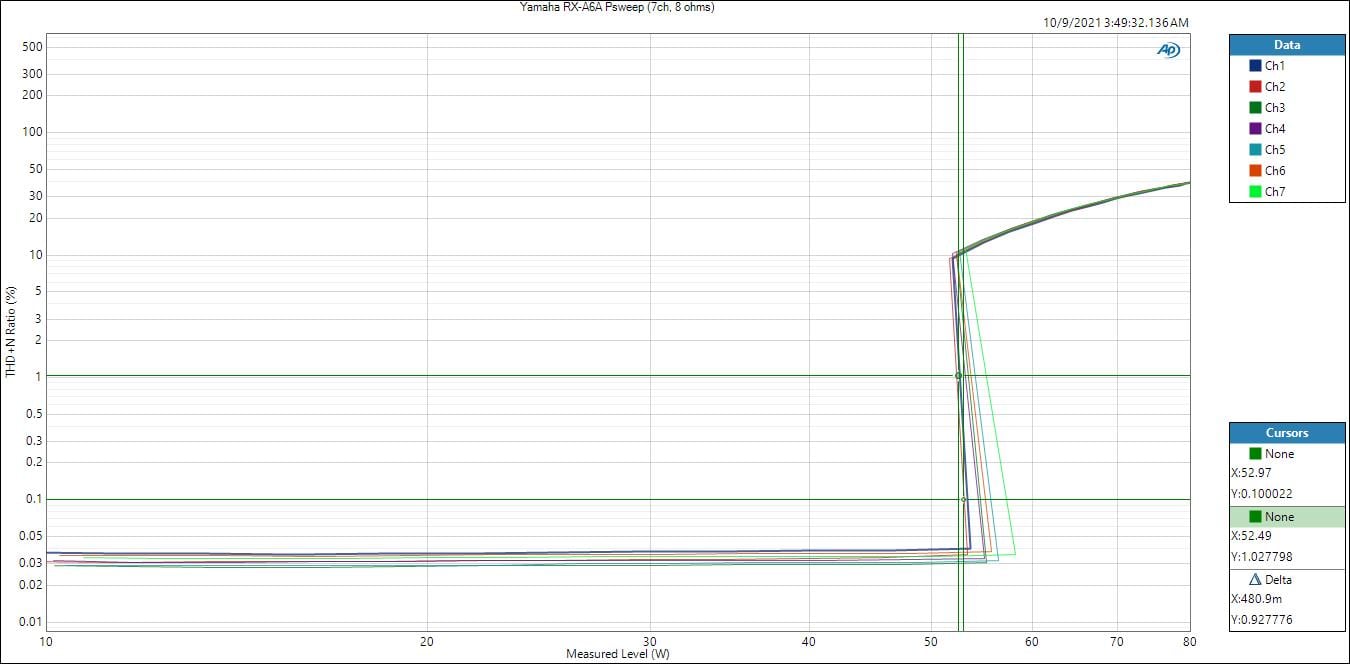 With 7CH driven, the RX-A6A limits power to 52 watts. This is not surprising as Yamaha has always set their limiters very conservatively. It’s unlikely you would trip this limiter with real program material, however.