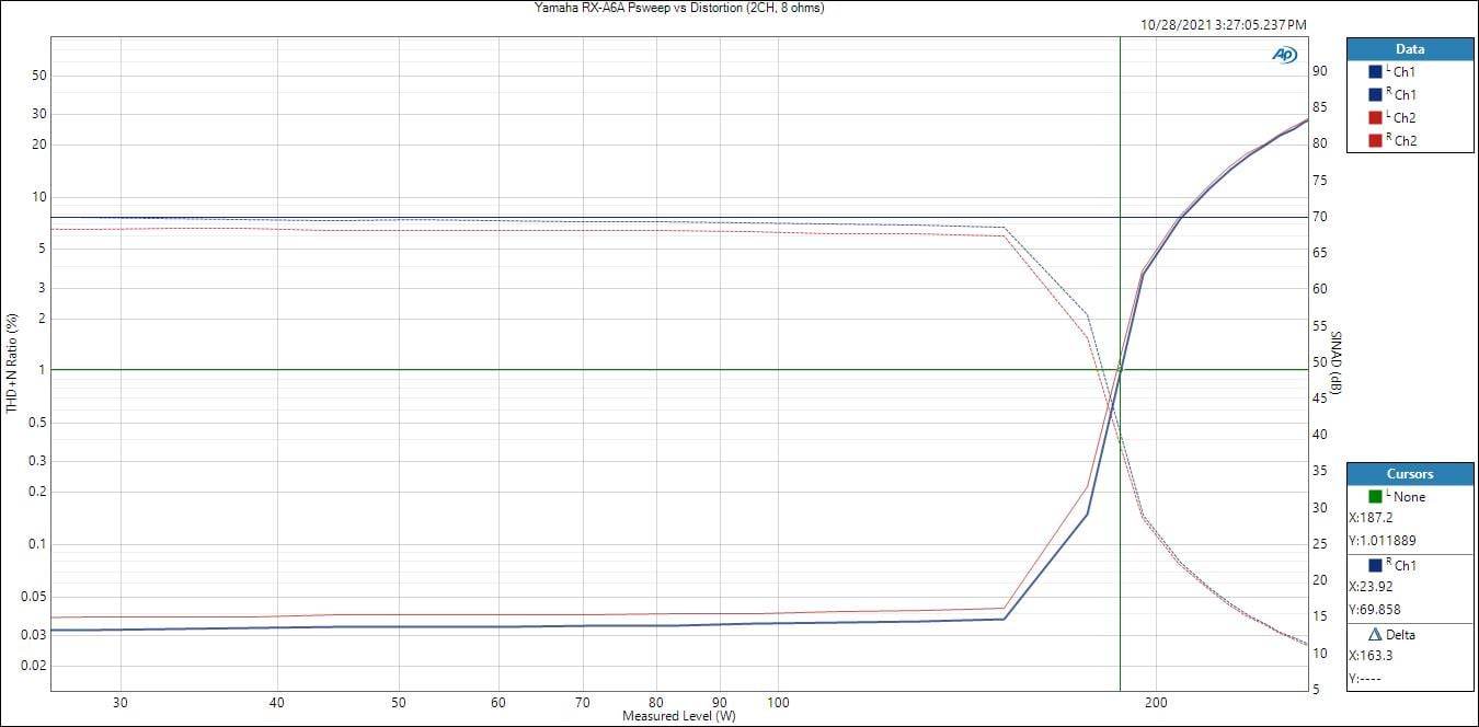 Yamaha RX-A6A Power vs Distortion (2CH, 8 ohms)