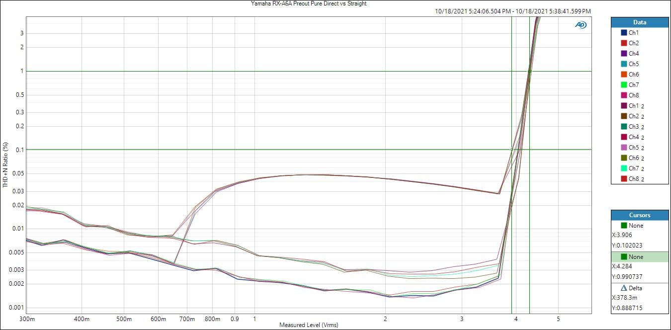 Even with a digital source, “Pure Direct” still showed a measurable improvement in distortion as you can see with the lowest vertical traces in the graph above.
