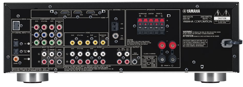 The RX-V365 has plenty of inputs and iPod functionality - thanks to a multi-pin docking interface that works with the optional YDS-11 or YBA-10 iPod/iPhone docks. Three S/PDIF inputs (1 coax and two optical) ensure ample connectivity for DVD players, cable set top boxes and a gaming system, but you are really limited to just 4 multi-channel audio sources - and that's if one of them uses the 5.1 analogue multi-channel inputs. Those who have more surround sources will need to bump up to the RX-V465 which also pulls the audio from up to 4 HDMI sources. The bump ups in Yamaha aren't all that straightforward, however. For example, jumping from an RX-V365 to an RX-V465 picks up HDMI audio, but loses one component video input, B speaker assignment, and multi-channel analogue inputs.