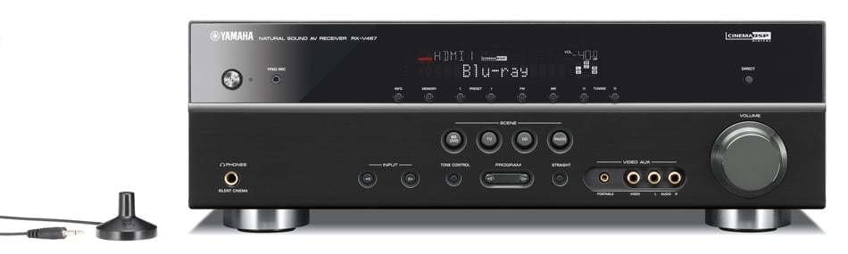 At $330, it gives you advanced features like the ability to decode the latest HD audio formats that come with nearly all Blu-ray Discs, like dts Master Audio and Dolby TrueHD. It also comes with a microphone, so you can use Yamaha's YPAO (pronounced "why-pow") system to automatically setup, level, and even equalize your speakers. The RX-V467 even includes the newest HDMI 1.4 feature - Audio Return Channel. Now this is pretty impressive. With a compatible display (and this is new so you may have to wait a bit for these to hit the market) you can actually send audio FROM the TV back to the receiver over a single HDMI cable. Why is this important? Well, if you're like me and have your TV mounted to your wall, it means that you can plug cable TV or antenna right into the television, and still get that audio to your AV receiver. The same HDMI cable that brings audio and video TO your TV, can also send audio FROM the TV back to your Yamaha. Nice.