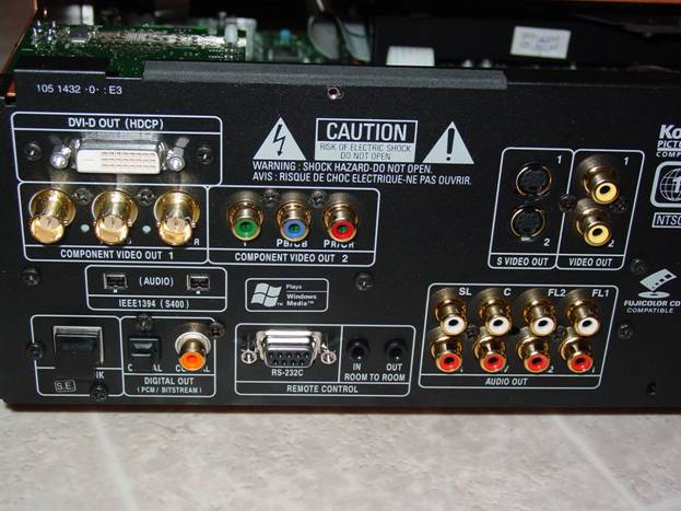 The back panels of the two units are certainly different. Kudos to Denon for providing true 75-ohm BNC component video output connections on the DVD-5900. This will simplify connections for those with front projectors, and will help decrease signal degradation for long cable runs . In addition, the 5900 also has two IEEE 1394 (S400) connectors, one DVI output (more on this later), a Denon link to connect to the Denon AVR-5803, two S-Video output connections and one RS-232C connector.