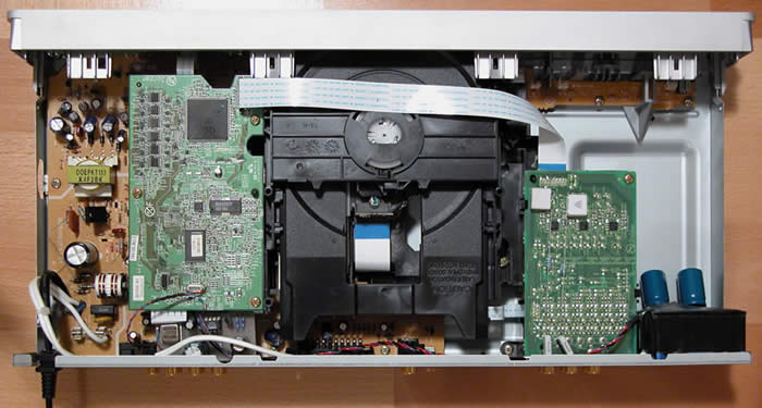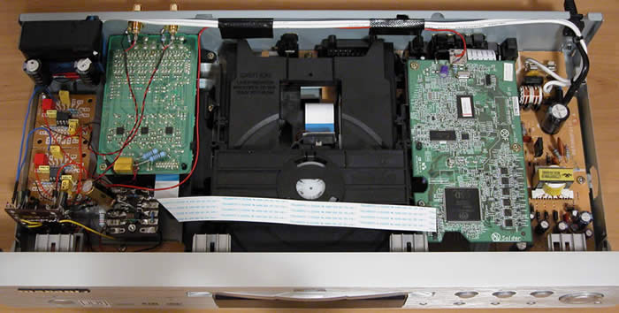 The stock unit is based on a previous generation Panasonic design (probably an OEM version of the DVD-F65). Essentially, almost all processing functions are handled by a single LSIC: Panasonic MN2DS0004AB. Video DACs are based on the MN35202 (10-bit 54MHz) and the player uses a single chip 8 channel Audio DAC: TI/Burr Brown DSD1608 (a multi-format, multi-level delta sigma modulator design rated at 108dB SNR/dynamic range and 0.0012% THD). The 2-channel audio analogue output uses a KIA4558F op amp, and the multi-channel analogue audio stage is based on JRC4580 op amps.