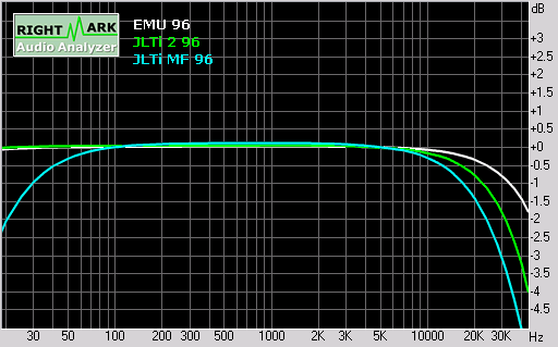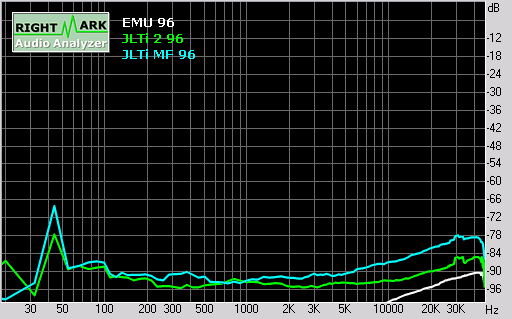 First of all, the output voltage is around -3dB below reference (no doubt due to the op amp analogue stage being bypassed), resulting in a slightly higher noise floor and correspondingly lower dynamic range, plus higher THD+N, IMD+N and stereo crosstalk.The following graphs are all based on measurement of the player playing back test tones at 96kHz 24-bit. In these graphs, the cyan plot is the modded Front Left/Right output, the green plot is the unmodded 2ch output, and the white plot is the E-MU 1212M measuring itself in loopback mode.The modded Front Left/Right outputs seem to attenuate both high and low frequencies more aggressively than the unmodded 2ch output, with the frequency response down -1dB at 30 Hz, and also -1.5dB at 20kHz: