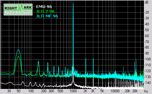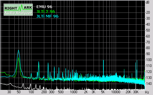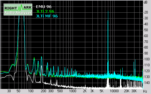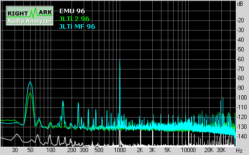 By contrast, the unmodded 2ch output is flat to 20Hz, and only down -0.75dB at 20kHz.In a conversation with Joe on these results, Joe indicated that the slightly more aggressive high frequency attenuation for the modded output was intentional, and deliberately tuned by ear for euphonic playback. Joe suggested the attenuation at low frequencies was due to the E-MU 1212M having an input impedance of 10 kohms, and would be a lot less for a normal pre-amp input at 100 kohms. If this is correct, it would suggest that the player needs to be matched with an appropriate pre-amp, and is not recommended for use with passive pre-amps.Looking at the noise level, the JLTi has a noise floor at least 10-20dB above the E-MU 1212M capture card. The most significant contributor to noise is residual 50Hz (fundamental plus harmonics) from the power supply. In addition, there are significant spikes at around 5kHz, plus several out of band spikes clustered around 30kHz.