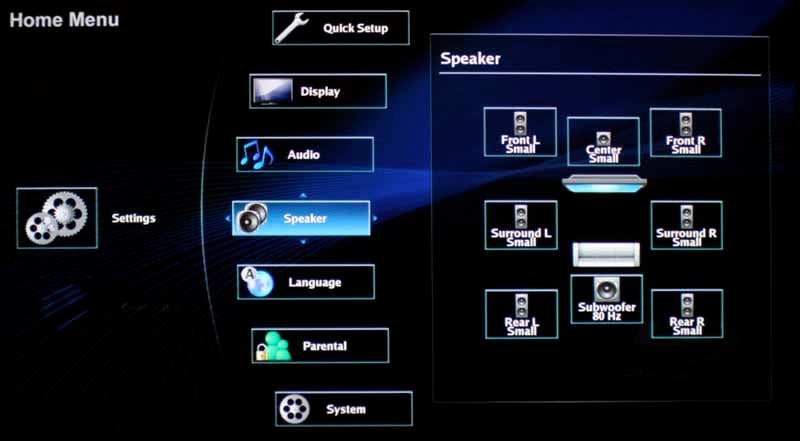 If you want to connect this player to a legacy system, Toshiba has included, as we indicated earlier, full 7.1 analogue outputs. Getting 5.1 analogue outs these days is a tough thing to find, so 7.1 is a rare gem at this price. The player has very minimal configuration for its analogue outputs, allowing you to apply basic bass management in the form of Large or Small speaker sizes. You can also set the crossover frequency (80Hz, 100Hz, 120Hz, Off). And get this, you can use either pink noise, a 1kHz sine wave, or white noise for your test tone to configure the speaker levels (we recommend Pink noise).