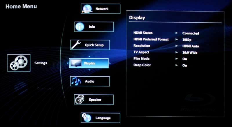 The Home Screen of the BDX2700 is made up of only two items, until you add more for it to consider. The way it is laid out, it populates itself with more items as they become available. That way, you can't select a BD-ROM when there isn't even one in the player. It's a nice way of eliminating useless error messages and we really enjoyed the layout. As we mentioned, the menu begins with Settings and Connected. Settings is of course where you will configure the player, access the Quick Setup and format your SD/SDHC cards, and Connected is where you can access the Network features like Netflix, Pandora, VUDU and Blockbuster.
