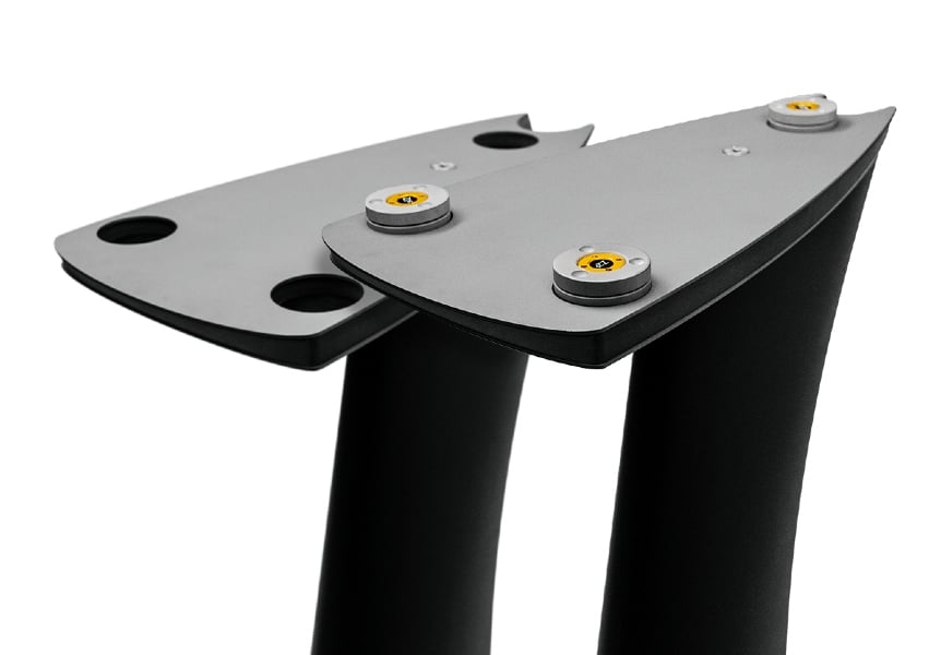 The M1 features three built-in puck-shaped resonance control decouplers mounted between the speaker and the stand. Sold separately for a mind-boggling $4,000 a piece, each Ansuz Darkz Z2S decoupler consist of three discs made of coated zirconium. Each of the upper two discs floats on three tungsten balls to handle and absorb vibrations. The Darkz decouplers reportedly provide better mechanical grounding of the speaker cabinet to the custom-designed stand below. Børresen says that the decouplers absorb vibrations that are not directly related to the signal path, prompting “a vibration feedback that audibly purifies the sound quality.” The M1’s cabinet is based on the $35,000 Børresen 01 speaker, but with additional 5mm braced, block-milled, pressed wood structures, along with side-mounted braces that provide increased rigidity and mechanical stability. The included stand has a machined top plate made of a sandwich material: a heavy, compact laminate panel is sandwiched between titanium top and bottom layers. The stand has built-in cutouts for the Ansuz Darkz Z2S resonance control decouplers. The stand’s column and feet are made of something called Natural Based Composite Material (NBCM), which is said to reduce distorting mechanical influence, especially hysteresis. The adjustable feet on the bottom cross plate are designed to sit on another set of Darkz resonance control decouplers (four per speaker).