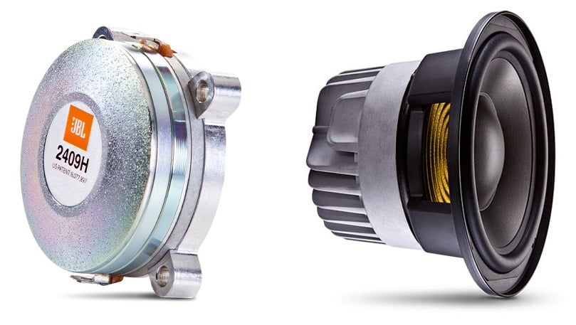 JBL Pro's new high frequency transducer (left) and 728G long-throw woofer (right).