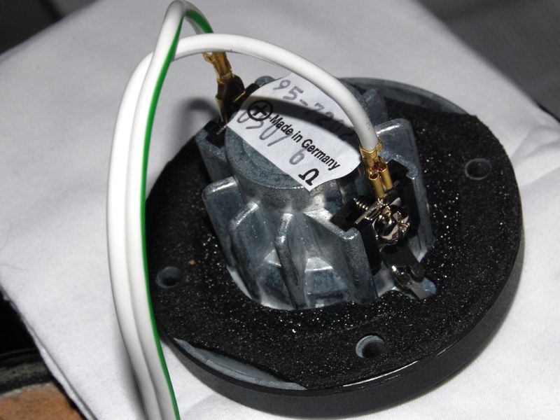 The two-way, front-ported speaker is arranged with the woofer on top, tweeter in the middle, and the slotted-port at the bottom. The high gloss black baffle also tapers slightly between the woofer and the port, making for a speaker that almost appears to be hiding a corset under it's skin. The woofer is a 6-1/2" Titanium damped cone with a dust cap that curves inward with the shape of the woofer. It is all black, including the resonance-free polyamide basket, which is reinforced with fiberglass. The tweeter is a 1" ferrofluid cooled Titanium dome, hidden behind a black mesh grill. It is equipped with a neodymium magnet, and is housed in a die-cast aluminum enclosure with specially designed cooling ribs. The assembly is weighty and solid - very well crafted.