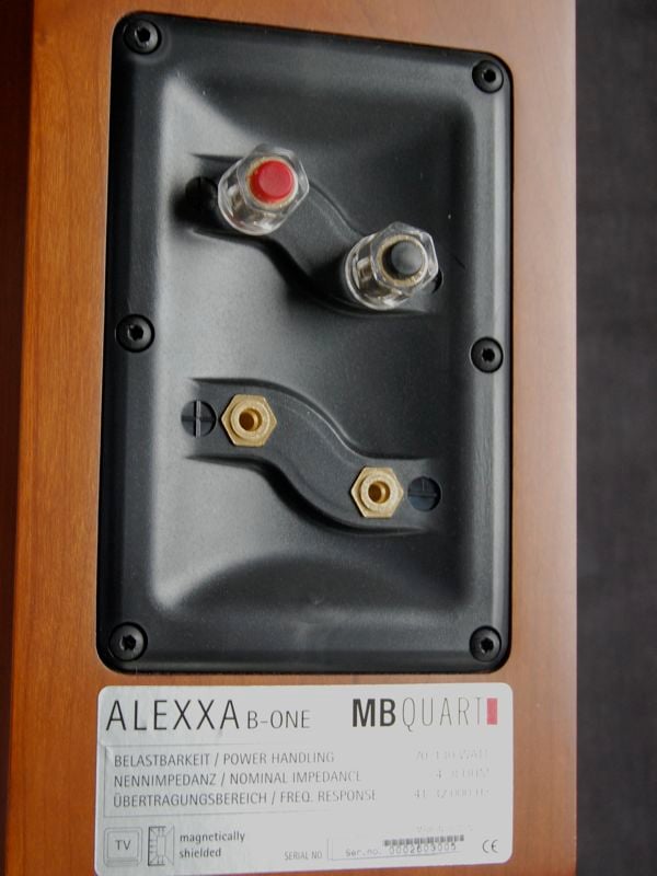 The Alexxa B-One is a gorgeous loudspeaker. My review samples were finished in a rich Cherry veneer, with a high-gloss black front baffle. The high-quality front grills were covered in black fabric, with the tasteful MB Quart logo centered at the bottom. (They look great without the grills. A nice touch is the MB Quart logo located on the faceplate as well as the grill, so people will know what they are even without the grills.) The grill frames are rigid, and are finished with chromed metal connectors that mate snugly with rubberized receivers on the front baffle of the speaker. The grill tapers slightly on each side towards the bottom, and is really attractive, although these speakers beg to be displayed without the grills.