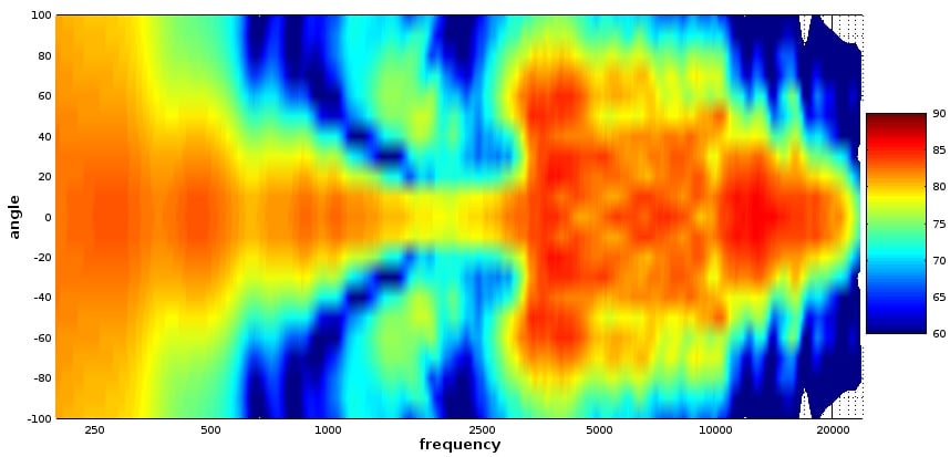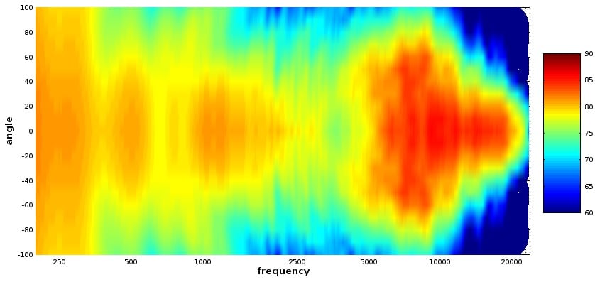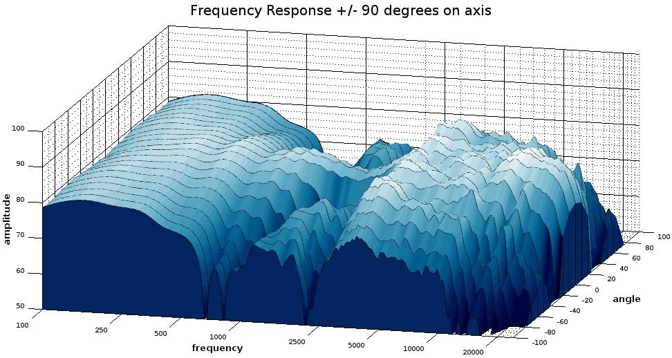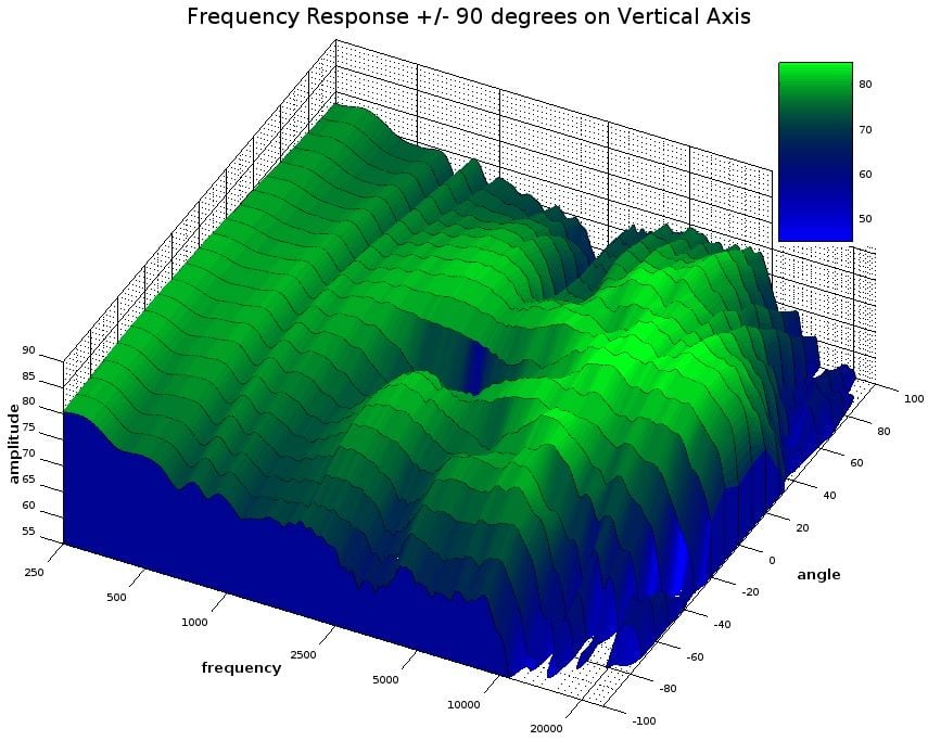 The above graph looks at the vertical dispersion of the MK442 from a profile view to get a better sense of its amplitude response. The vertical response of the MK442 is much better than its horizontal response- but since the horizontal response is so much more important and consequential than the vertical response, what are we going to do? The solution, if possible, is to use it on its side, like so: