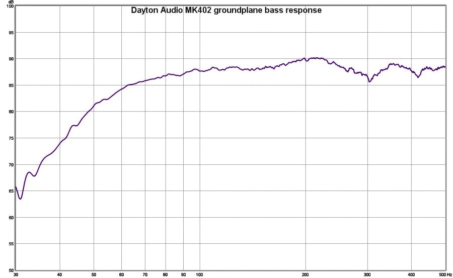 The above graph shows the MK402’s low-frequency response that I captured using groundplane measurements (where the speaker and microphone are on the ground in a wide open area). The MK402 has a very good bass response when its size and price are considered. These legitimately dig down to 60 Hz and should even be able to provide decent 50 Hz output if used in a placement that gives it some boundary gain such as nearby a wall or on a desktop. The bass is relatively smooth too and doesn’t have a boosted response around port tuning like many budget speakers. This speaker will play bass notes evenly and clearly, and that has to be considered a minor miracle at this size and pricing. However, at higher drive levels, the 1” port of the MK402 do get overloaded and will go into audible turbulence (“chuffing”) on content that has very low frequencies. The same is likely true of the MK442 since it has a similarly-scaled port diameter for its two woofers instead of just one, although I did not hear any audible chuffing from the MK442 during my time with it. A subwoofer would be useful here to take a heavy load off the port and greatly reduce the potential for port chuffing.