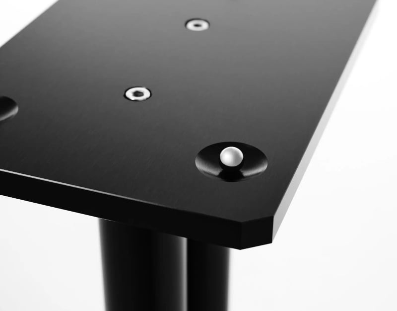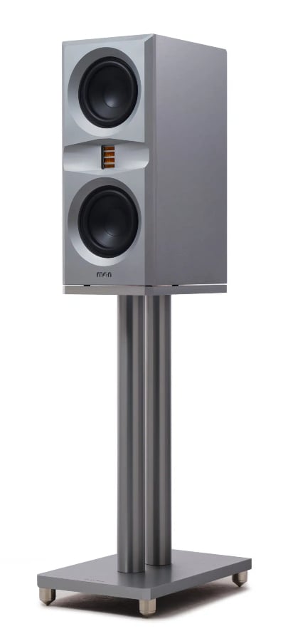 The PlatiMon is a 2-way “virtual coaxial” stand-mount speaker with a vertical MTM design. Two 5-inch mid-woofers sit above and below an AMT (Air Motion Transformer) tweeter in a slender, ported aluminum cabinet measuring 17 inches tall by 7.5 inches wide by 10.6 inches deep. The speakers weigh 32 pounds each, not including the chunky aluminum stands. The enclosure is reinforced with 6061-grade aluminum, promising “transparent and modern, clear sound.” The finishing quality is top-notch, thanks in part to a “hyper brushing technique” that ensures a premium appearance.