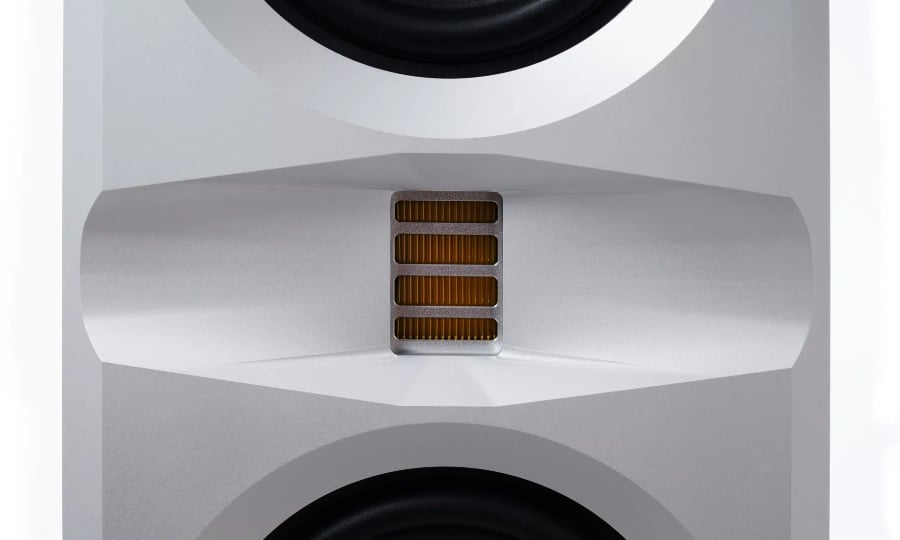 The AMT tweeter handling those high frequencies was designed in-house but is made in the USA to MonAcoustic’s specifications. It handles everything above about 3,100 Hz, according to the company. The tweeter is placed inside a wide, chiseled waveguide milled into the meticulous-looking aluminum baffle. The 5-inch mid-woofers are made in Germany, and reportedly use special neodymium magnets. The driver plays flat down to 53 Hz before beginning to roll off, according to MonAcoustic.