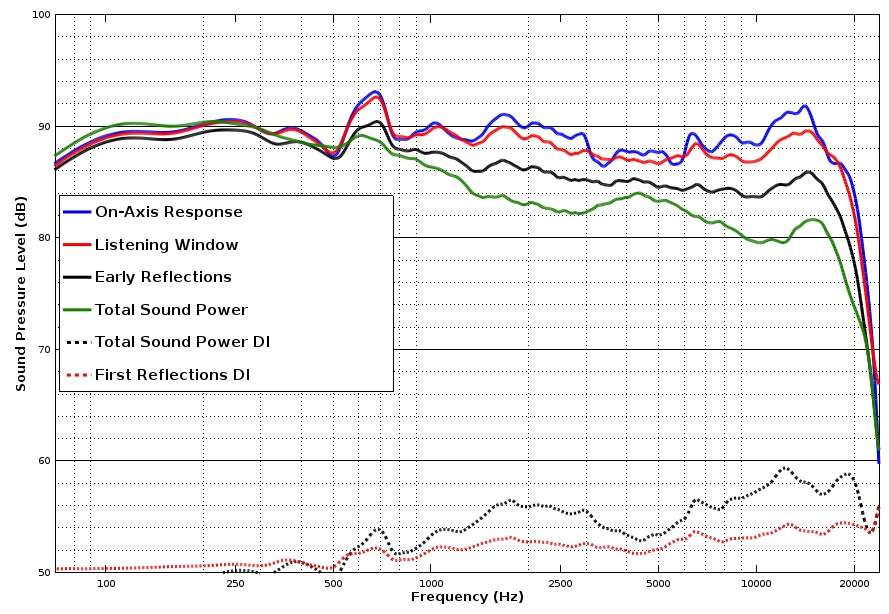 The Monoprice K-BᾹS speaker measures well, although there are some slight imperfections. Most visible is a 3 dB, high-Q resonance around 700 Hz. This resonance may have high enough of a Q and low enough amplitude to be inoffensive, and in my listening I did not notice anything amiss in this region. What is likely to be more audible is the 2 dB dip from 3 kHz to 6 kHz, but since this doesn’t show up in the curves involving off-axis responses, I don’t think it is a problem. The scale of this graph and the low amount of smoothing (1/24 octave) make it a bit unsparing of any irregularities. The ‘Listening Window’ is exceptionally smooth above 800 Hz, which means this speaker should have a wide ‘sweet spot’ at least out to 30 degrees to the sides of the speaker, and it should be good for situations that need good coverage for that broad a listening area. The ‘Total Sound Power’ curve and its corresponding directivity index would seem to indicate some extra off-axis energy from 3 kHz to 6 kHz, which may mean those frequencies will be more reflected off-axis than neighboring frequency bands. However, the ‘Early Reflections’ curve is very smooth, and this bodes well for the end results since ‘Early Reflections’ can be a good predictor of the room sound, so extra off-axis energy from 3 kHz to 6 kHz is not something to be overly concerned about. For a good explanation of these curves and their significance, we refer the reader to this Audioholics article: Objective Loudspeaker Measurements to Predict Subjective Preferences.