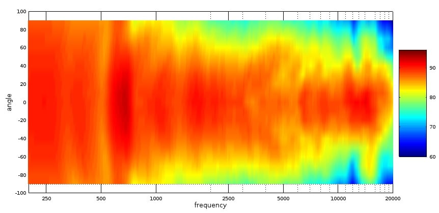 The above graph displays the dispersion of the K-BᾹS speakers on its vertical axis. Before you panic, it should be said that the vertical dispersion isn’t nearly as important as the horizontal dispersion. This is a very typical pattern for this kind of bookshelf speaker. We see a narrow strip of a regular response on-axis, but lobing effects quickly create deep nulls as the response goes past ten degrees off axis in either direction. This is the result of the woofer and tweeter cancelling out each other’s sound around the crossover point; this is inevitable with this type of driver layout. On this scale, the negative degrees are below the tweeter, and positive degrees are above the tweeter. What this graph says is that, as with most speakers, the K-BᾹS speakers should not be placed on their side and are best listened to with the tweeter roughly at ear level.