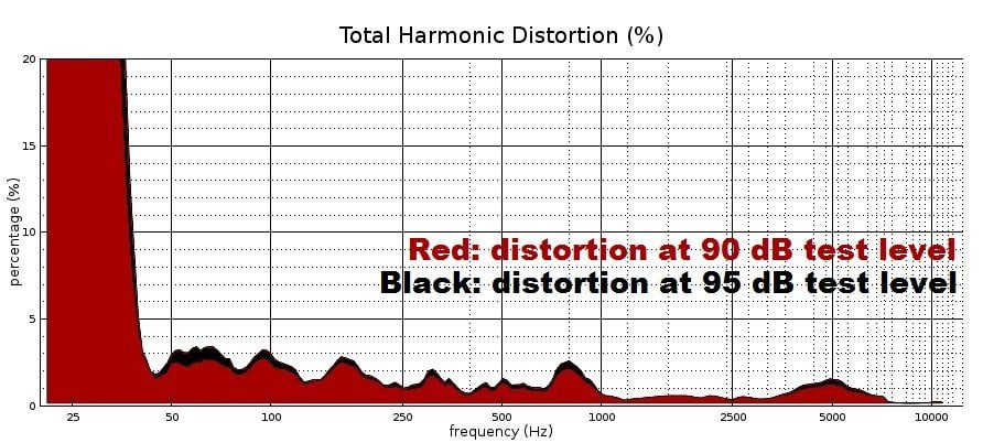 The above graph depicts the total harmonic distortion of the K-BᾹS speakers at 90 dB and 95 dB sweep levels. This level of distortion looks very good for this loudness level, especially in lower frequencies. The only thing in here that could come close to being audible is the bump almost touching 3% around 700 Hz, and it would have to be using a pure tone in laboratory conditions to be heard. The third harmonic is the dominant harmonic throughout this distortion profile, but the second harmonic does crop up at the 700 Hz bump, which is almost entirely second order harmonic distortion. The ridges of distortion in lower frequencies would be totally inaudible, since human hearing is much less sensitive to distortion in that band. The beefy midwoofer driver looks to be paying off in these tests. This speaker could have taken higher levels than this and still retained its composure, but the point was already made. This is a fine showing, and the K-BᾹS speakers can stay clean at relatively loud levels.