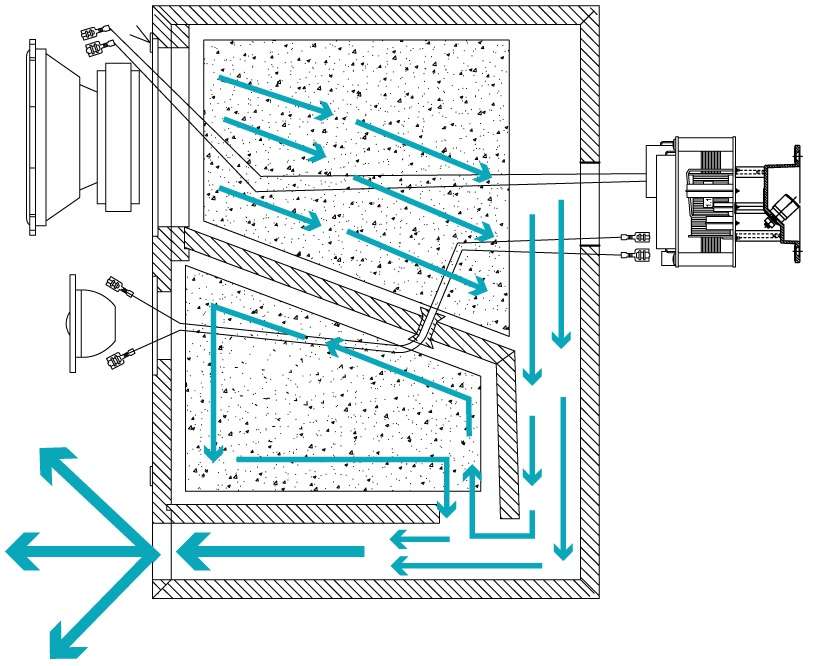 Within the cabinet, the backwave pressure caused by the rear-facing side of the cone get squeezed through a progressively smaller space as it travels toward the port. This squeezing increases air pressure as the pressure waves move through the cabinet. The pressure waves also pass by a chamber that acts as a Helmholtz Resonator. Helmholtz Resonance is the physical principle behind the phenomena where, when you blow air over the top of a bottle or jug, a distinct sound is produced, and it is how ports produce sound on conventional bass reflex speaker designs. The heightened flow of pressure waves amplify the sound produced by the Helmholtz Resonance in the K-BᾹS enclosure. Furthermore, the chamber by which the Helmholtz Resonance is created is heavily damped with Dacron, which helps to filter out harmonic distortions that might have developed from previous chambers. By the time the pressure waves exit the port on the K-BᾹS, they have been increased in amplitude and lowered in frequency, so the system can produce deep bass very efficiently.