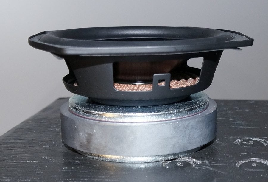The cabinet itself is relatively sturdy, with a ¾” thick front baffle and ½” thick sidewalls. The interior chamber paneling does serve very effective double-duty as bracing to reduce cabinet resonance. The cabinet is generously stuffed with Dacron in order to damp resonances as well. The speaker terminals are a pair of sturdy binding posts. The cabinets do not come with feet attached, but Monoprice has included small rubber dimple ‘stickers’ that can be attached and used as feet. Overall, the design looks to be solid, with a reassuring attention to detail.