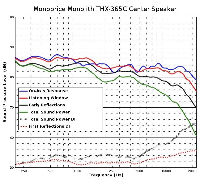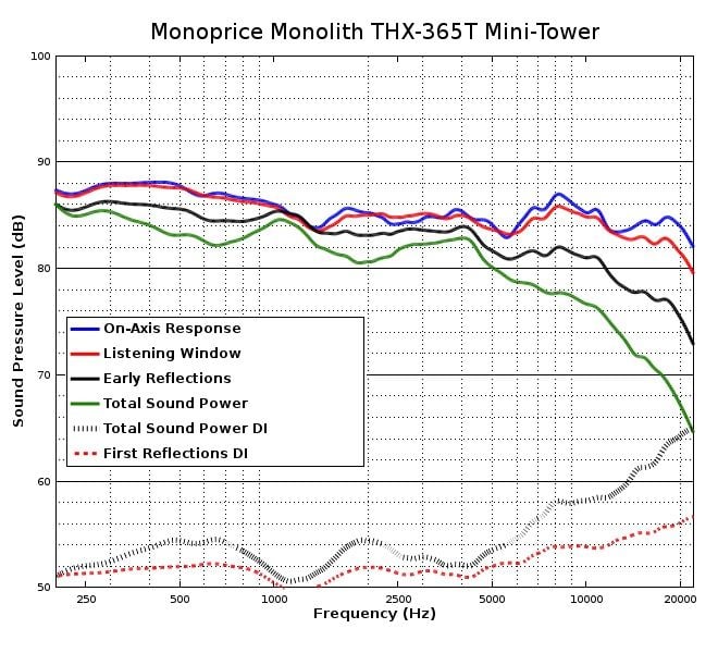 The Monoprice Monolith THX speakers were measured in free-air at a height of 7.5 feet at a 2-meter distance from the microphone, and the measurements were gated at a 9-millisecond delay. In this time window, some resolution is lost below 250 Hz and accuracy is completely lost below 110 Hz. Measurements have been smoothed at a 1/12 octave resolution.