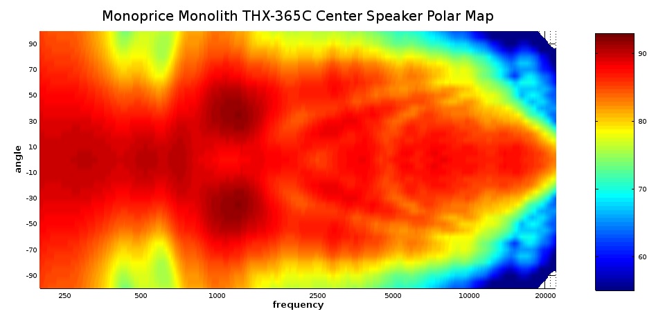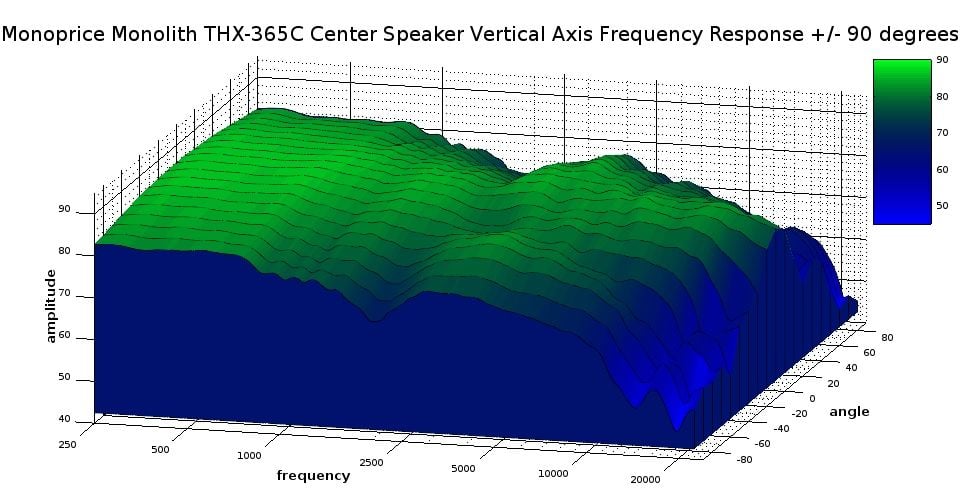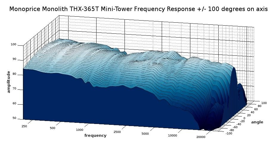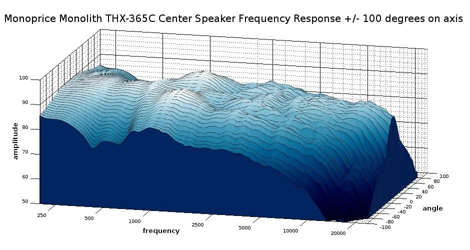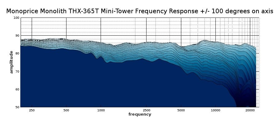 The above graph shows the Monolith THX speakers’ response behavior along its vertical axis where zero degrees is directly in front of the tweeter, negative degree values are below the tweeter, and positive degree values are above the tweeter. It should be said here that the vertical response isn’t nearly as critical as the horizontal response, so an imperfect vertical dispersion is much less of a problem. The responses seen here are unusually good for this type of speaker. There are lobing nulls caused by conflicting drivers off-axis, but they are very moderate compared to what is normally seen. These speakers actually have a relatively wide vertical angle off-axis where no severe nulls occur. They will probably never be listened to at an odd vertical angle, but it doesn’t hurt to have a good off-axis vertical response due to the consistency in sound from the acoustic reflections from the floor and ceiling.