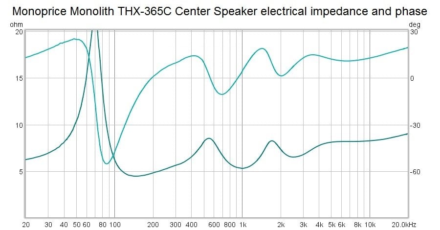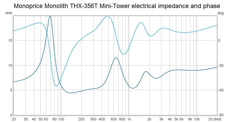 The above graphs show the electrical behavior of the Monolith THX speakers. Again, there is not much point in posting both graphs since they are so similar, but we have done so any way to demonstrate their similarity. Monoprice specs these as 4-ohm speakers, and in that they are correct. The impedance never dips down below 4 ohms, but the steep phase angle at the impedance minima between 100 Hz and 200 Hz may be a tough load for cheaper amps. Budget amplifiers should be OK with this load if it isn’t played loud, but who buys THX speakers to only be played at soft volumes? Outside of a small but important frequency band between 100 Hz and 200 Hz, the electrical load is fairly easygoing. I wouldn’t task an entry-level AVR amp with running these speakers, but a mid-level AVR should be OK.