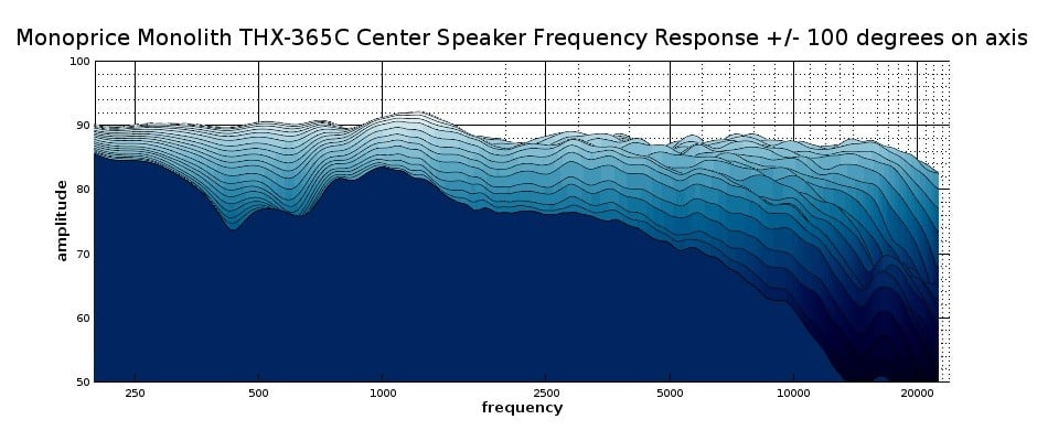 The above graphs depict the Monolith THX speakers’ lateral responses out to 100 degrees in five-degree increments. More information about how to interpret these graphs can be read in this article: Understanding Loudspeaker Review Measurements Part II. Once again, we see how well behaved these speakers are, but these graphs show us how well the horizontal off-axis response correlates with the on-axis response in greater detail. As the directivity indexes suggested, these speakers hold a nicely uniform axial response up to 5 kHz where the tweeter does roll-off quite a bit more at farther off-axis angles. We do see a slight amount of off-axis cancellation from the woofers in the center speaker, but it is extremely mild compared to what occurs in most two-way center speakers. This response from this center speaker is very good and places it among the best center speakers we have measured to date.