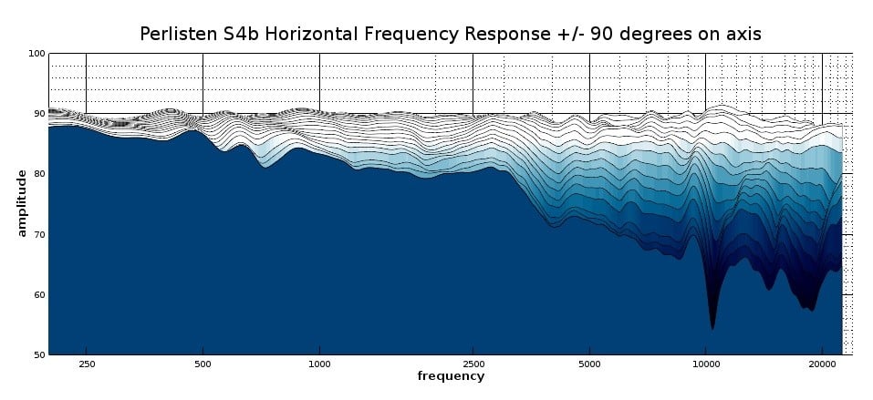 Here we can see how constricting the beamforming array is on the midrange/tweeter band. It doesn’t extend to the woofer’s band of 1kHz and below since there is only one woofer which is not enough to form an array. The Perlisten S7t tower speakers used their four bass drivers down to 300Hz. Nonetheless, this tight beam of vertical dispersion is much better controlled than pretty much any other bookshelf speaker in this class. The best sound coverage occurs at +/-15-degrees, so if these speakers are placed anywhere near ear height, you will be met with a smooth response. With so little output at far off-axis vertical angles, acoustic treatments aren’t all that beneficial for these speakers, so don’t worry about using a heavy rug or ceiling diffusers for bettering the sound; the S4bs don’t need that. The symmetry of the response from the upper angle to the lower angle is remarkably, again better than most loudspeakers in this class. There is only one small asymmetry of note in the upper angle of around 30 to 40-degrees at 1kHz that is a crossover cancellation. It is a very mild null for crossover cancellation which is evidence of a highly optimized crossover circuit with steep filter slopes.