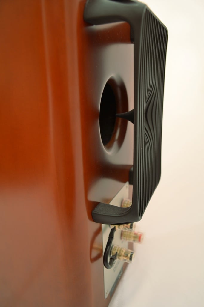 For starters, the top of the cabinet is curved, and the sides taper off towards the back to create a wedge-shape. This helps reduce internal resonance and standing waves, but it also makes the speaker look cool and less "boxy". The enclosure itself is made of MDF with 1” baffles on the sides, ¾” on the back and bottom, and 1 a ¼” thick front baffle. Everything is then finished off with a hardwood veneer, available in such creative names as Mt. Vernon Cherry or Midnight Mahogany. I attempted to take the speaker apart to get a better look at internal bracing, but the only visible screws are on the binding posts…and it’s glued in place. So, no internal pictures for this review.