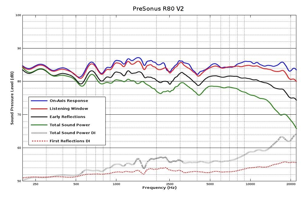 The PreSonus R80 V2 was measured in free-air at a height of 7.5 feet at a 1-meter distance from the microphone, and the measurements were gated at an 11-millisecond delay. In this time window, some resolution is lost below 250 Hz and accuracy is completely lost below 110 Hz. Measurements have been smoothed at a 1/24 octave resolution.