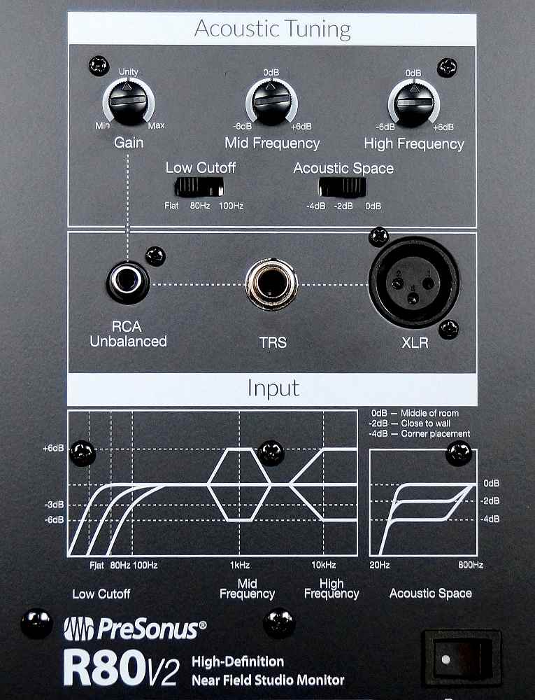 The 8” woofer uses a woven composite cone that has a beefy-looking surround. It uses a ¾” thick, 4” diameter magnet on the motor that is vented through the pole piece. The woofer is driven by a 75-watt amplifier, and the tweeter is driven by a 65-watt amplifier for a combined total of 140 watts of amplification using a class A/B amplifier. Most of the competing monitors have moved on to class-D amplifiers, but PreSonus has stayed with class-A/B for its lower noise floor that those amps tend to have in this class. Unfortunately, the R80 V2 still emits a hiss, although it’s no worse than what is normal in this segment. If the class-A/B amplifier reduced the noise floor, it only went from worse-than-average to merely average. The PreSonus Eris E8 XTs fared better in this regard with a lower noise floor.