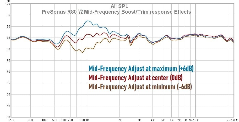 PreSonus mounts the AMT in a waveguide that is geared for a wide horizontal dispersion but a narrow vertical dispersion. This strategy is common to many monitors in this class, and their reasoning for it is that reflections from vertical surfaces cause problematic acoustic issues that degrade the sound. I do have two problems with this design strategy. First, there is not much actual research to show that vertical reflections in normal situations do hurt the sound quality in significantly audible ways. Second, many monitors, the R80 V2 included, only take measures to constrain the tweeter’s dispersion but not the woofer’s dispersion. The problem with that is now the vertical acoustic reflections are spectrally uneven; you will get acoustic reflections from the woofer but not the tweeter. If vertical reflections do degrade the sound, having an uneven balance of those reflections may be the worst-case scenario. Luckily for us, there isn’t much to suggest that it does hurt the sound in typical situations.