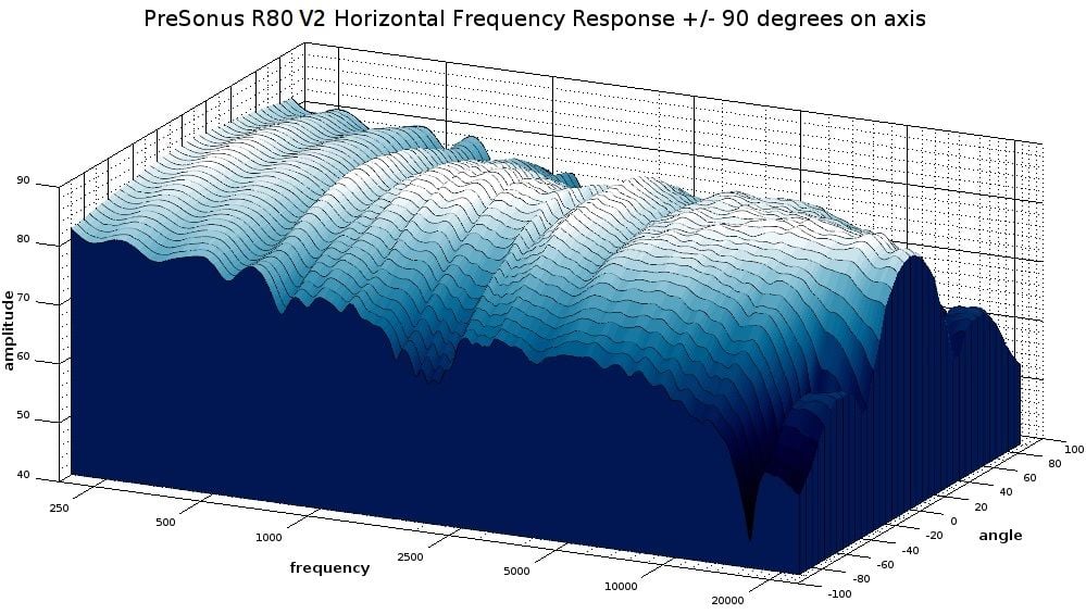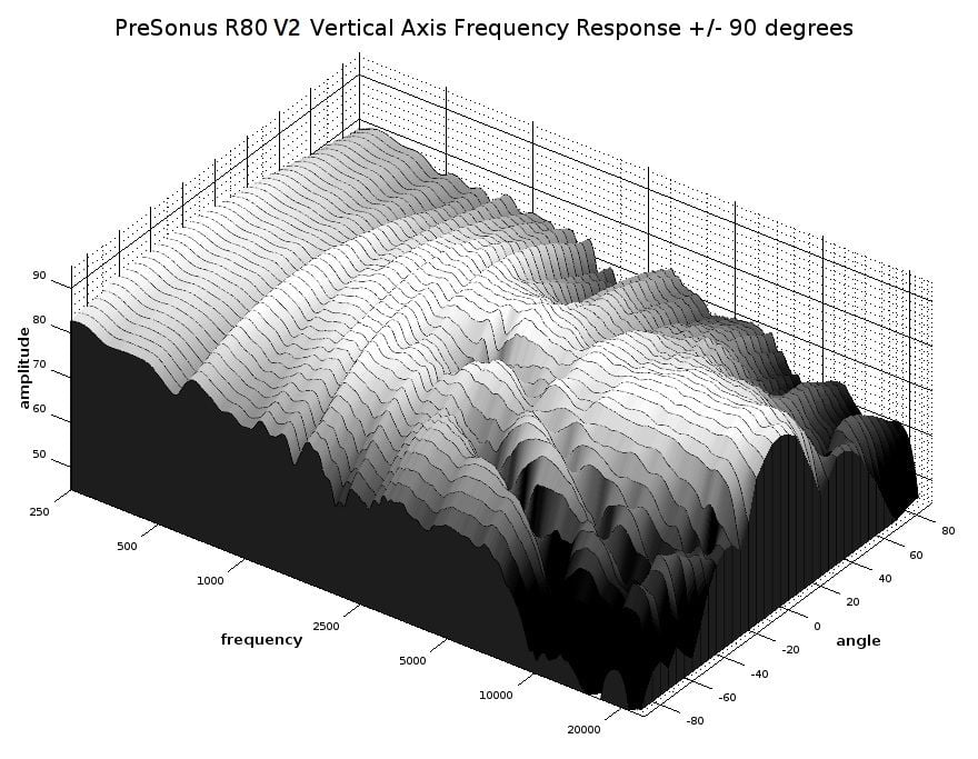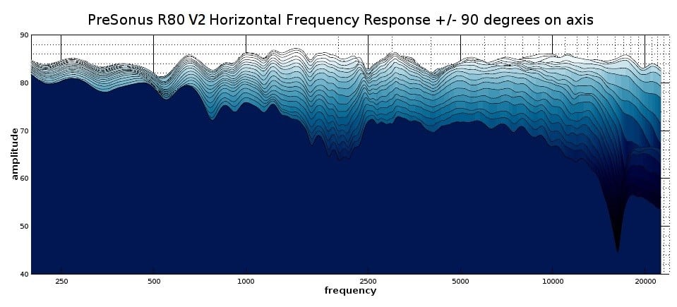 The above graph shows the R80 V2’s response behavior along its vertical axis where zero degrees is directly in front of the tweeter, negative degree values are below the tweeter, and positive degree values are above the tweeter. One important feature that we can see here is that the crossover null emerges very quickly at angles below the tweeter. Any speaker where drivers are separated by a distance greater than half a wavelength at the crossover frequency (meaning almost any speaker that isn’t using coaxial drivers or a single full-range driver) will suffer a null at some angles where the difference in distance causes a phase mismatch between the drivers in a shared frequency range at the crossover. Typically, it starts to set in outside of a 15-degree angle above and below the on-axis angle, but in the R80 V2s, it is becoming acute at 10 degrees below the tweeter. That means that this speaker should be listened to at or somewhat above the tweeter height, but not below the tweeter. The vertical response does stay strong out to 25 degrees above the tweeter, so that does give the user a good margin in which to aim the R80 V2 for the best sound. This is a trait we also saw in our review of PreSonus’s Eris E8 XT speaker.