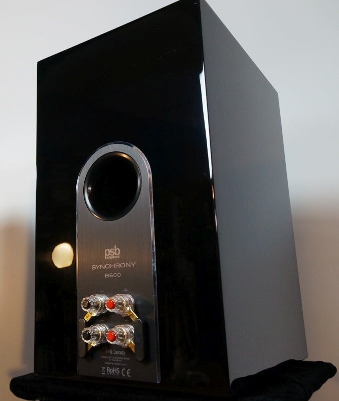 While the B600 speakers look good, the styling doesn’t break any new ground with respect to high-end loudspeakers. They are basically oblong boxes that are made to look as nice as oblong boxes can look. It’s like functionality came first on these speakers, and then they were handed to industrial designers who had to work around a set design. There is no cabinet curvature here, so they can’t really escape their boxiness. The edges aren’t really beveled or shaped, although there is a very slight rounding in order to keep them from becoming hard angles. The units that I received came in the gloss black finish, and it was nicely done with no irregularities or orange peeling that I could see. The B600s also can be had in a satin walnut finish. The most notable visual feature is a brushed black aluminum plate on the front baffle that holds the drivers. The aluminum plate does have a slight beveling which lends the B600s a somewhat stately demeanor. There is also a smaller aluminum plate on the rear panel that holds the port and binding posts. Since the rear is usually out of sight, PSB didn’t really have to do that, but it does lead to an aesthetic symmetry that I can appreciate.