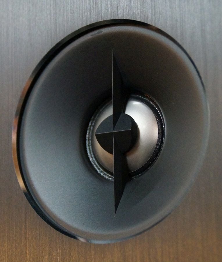The tweeter is mounted in a small conical waveguide, and this should help control the directivity of the sound, especially at the lower end of its bandwidth. That is a good idea when mating a 1” dome tweeter with a 6.5” woofer. The combination of a 1” dome tweeter with a 6.5” woofer is very common with two-way bookshelf speakers. However, the fact is that they don’t normally have perfect directivity matching, because the woofer will start to narrow its dispersion at any usable crossover frequency for a typical 1” dome tweeter. The directivity mismatch between these driver sizes is not usually a major audible flaw, but it can cause irregularities in the off-axis that a waveguide can prevent. A phase lens is built into the waveguide that covers the center of the tweeter dome. The purpose of a phase lens is to block sound from the raised center of the tweeter from reaching the listener, as its forward distance will cause it to be slightly out of phase with the lower edges of the dome. Such a small distance difference will likely only make any difference in very high frequencies. Another advantage is that the phase lens could offer additional protection against anything striking the fragile metal dome.