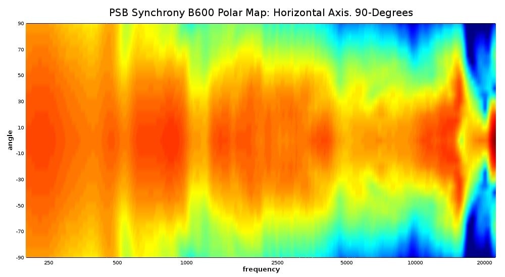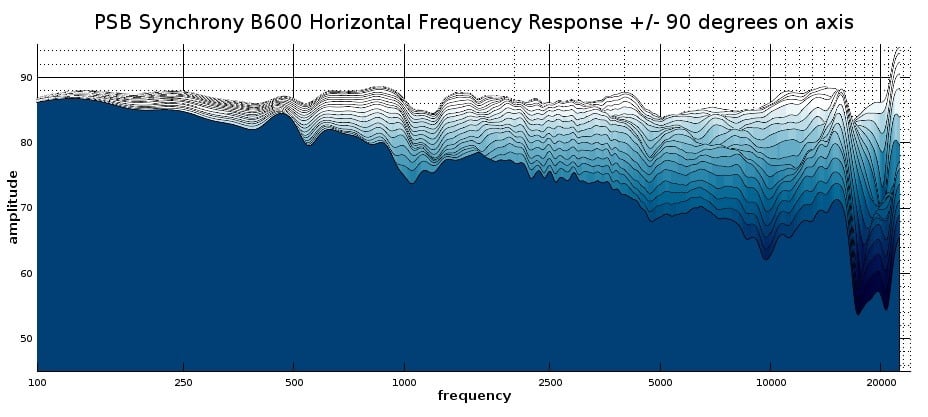 The above graphs depict the speaker’s lateral responses out to 90 degrees in five-degree increments. More information about how to interpret these graphs can be read in this article: Understanding Loudspeaker Review Measurements Part II. There isn’t a lot to see in these graphs that weren’t already seen in the previous graph. We do get a better look at just how high the correlation that the off-axis responses have to the on-axis response is. We also get a better look at the wooliness in the high treble region. I would guess that a lot of that has to do with the phase lens that is placed over the center of the tweeter. Again, unevenness above 15kHz is unlikely to manifest in anything audible unless it is extreme. The overall story here is that the B600s should have a nicely linear sound both on and off-axis.