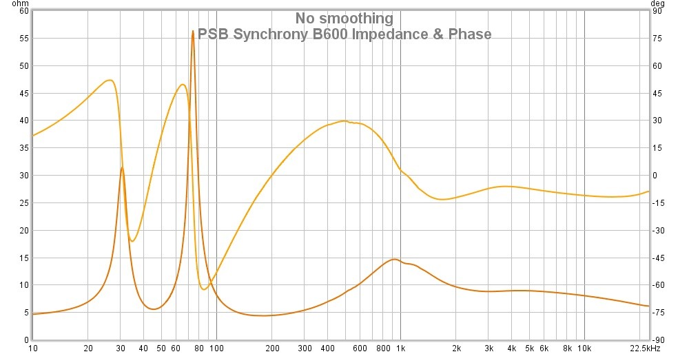The above graph shows the electrical behavior of the PSB Synchrony B600. PSB specs this speaker to be 6 ohms nominal with a 4-ohm minimum. This should really just be considered a 4-ohm speaker. While most of the range stays well above 5 ohms, the speaker does dip to 4 ohms around 200Hz along with a fairly steep phase angle. Any decent amp should be able to handle that load just fine, but that might be pretty taxing for a cheap amp if you are really blasting these speakers. We can see from the dip between the low-frequency resonances that the port tuning frequency is about 45Hz. We can also see from the right-side peak being so much higher than the left that the resonant frequency of the enclosure is much higher than that of the driver. That is what I would expect since I doubt this 6.5” woofer’s resonance is anywhere near 45Hz.
